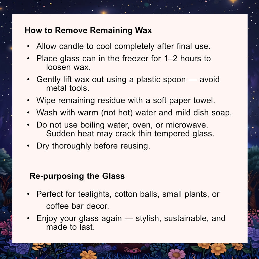 - Keep the burning candle within sight, and keep away from children and pets. Never burn the candle near flammable items. For best results, burn the candle for 3 - 4 hours in each lighting and trim the wick to 1/4" before lighting. Discontinue use with 1/2" of wax remaining.