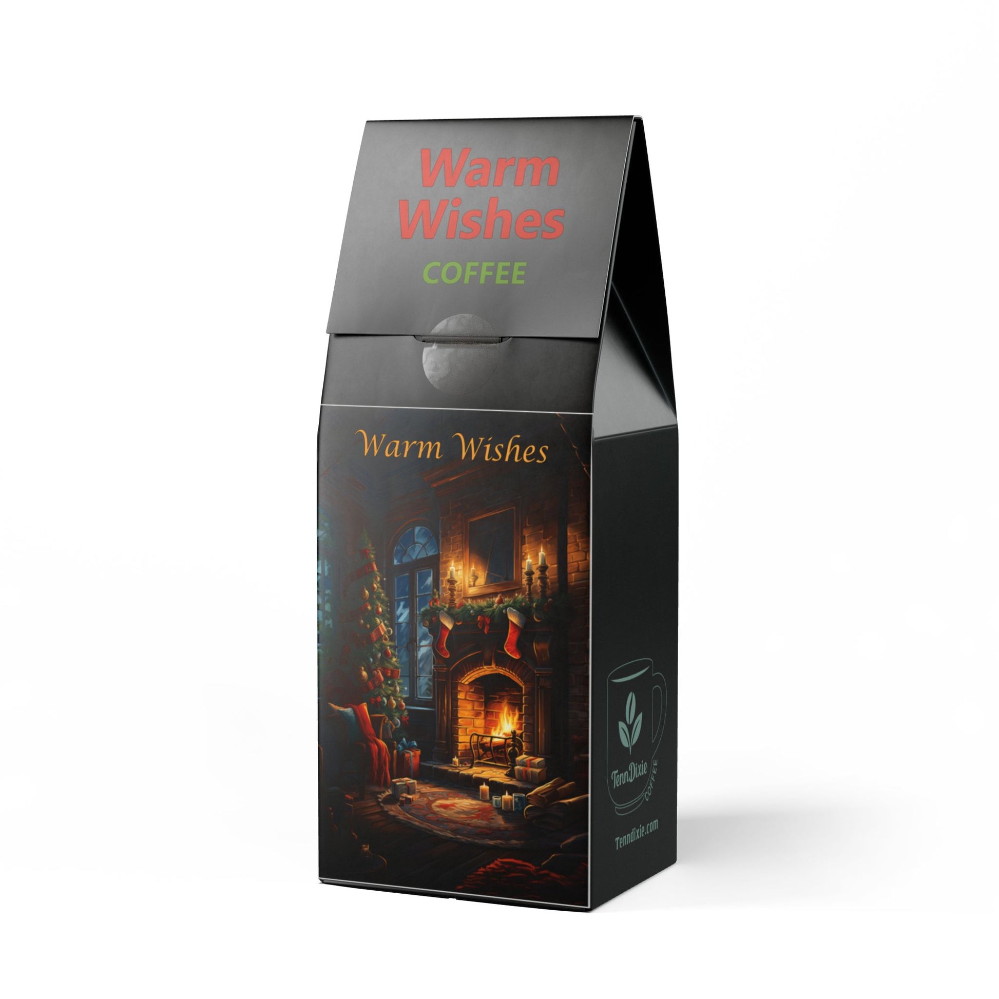 Warm Wishes Coffee, a blend of smooth, medium-dark roasted coffee beans. The design celebrates a joyous Christmas season. Expertly crafted in small batches and roasted in the USA, this specialty-grade blend delivers bold toasted nut and cocoa notes balanced by a hint of caramel sweetness.